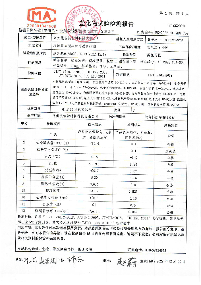 履信T-SEN溫敏型抗凝冰材料第三方CMA認證報告